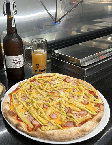 La CurryWurst: Tomate, Mozzarella, saucisses de Francfort, cheddar, frites, oignons frits, sauce curry